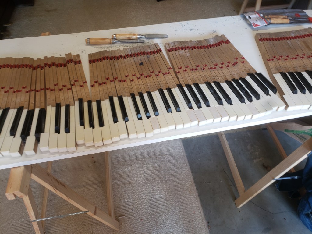 Clavier : Réparation des ivoires et complétion des touches aux ivoires manquants, renivellement et reprise de l’enfoncement, révision des plombs, graphitage pilote de touche