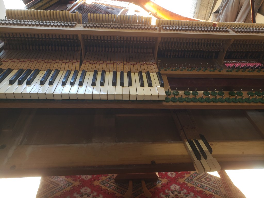 Mécaniques : Révision des mécaniques, Révision des feutres d’étouffoirs pour uniformisation, Changement de tous les rouleaux de marteaux, ponçage des marteaux.