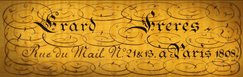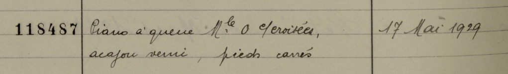 Les archives Erard nous indiquent que ce piano à queue de 1929 (modèle 0), de facture cordes croisées, cadre fonte, en acajou est sorti d’atelier le 17 Mai 1929 pour être commercialisé dans une boutique à Reims.